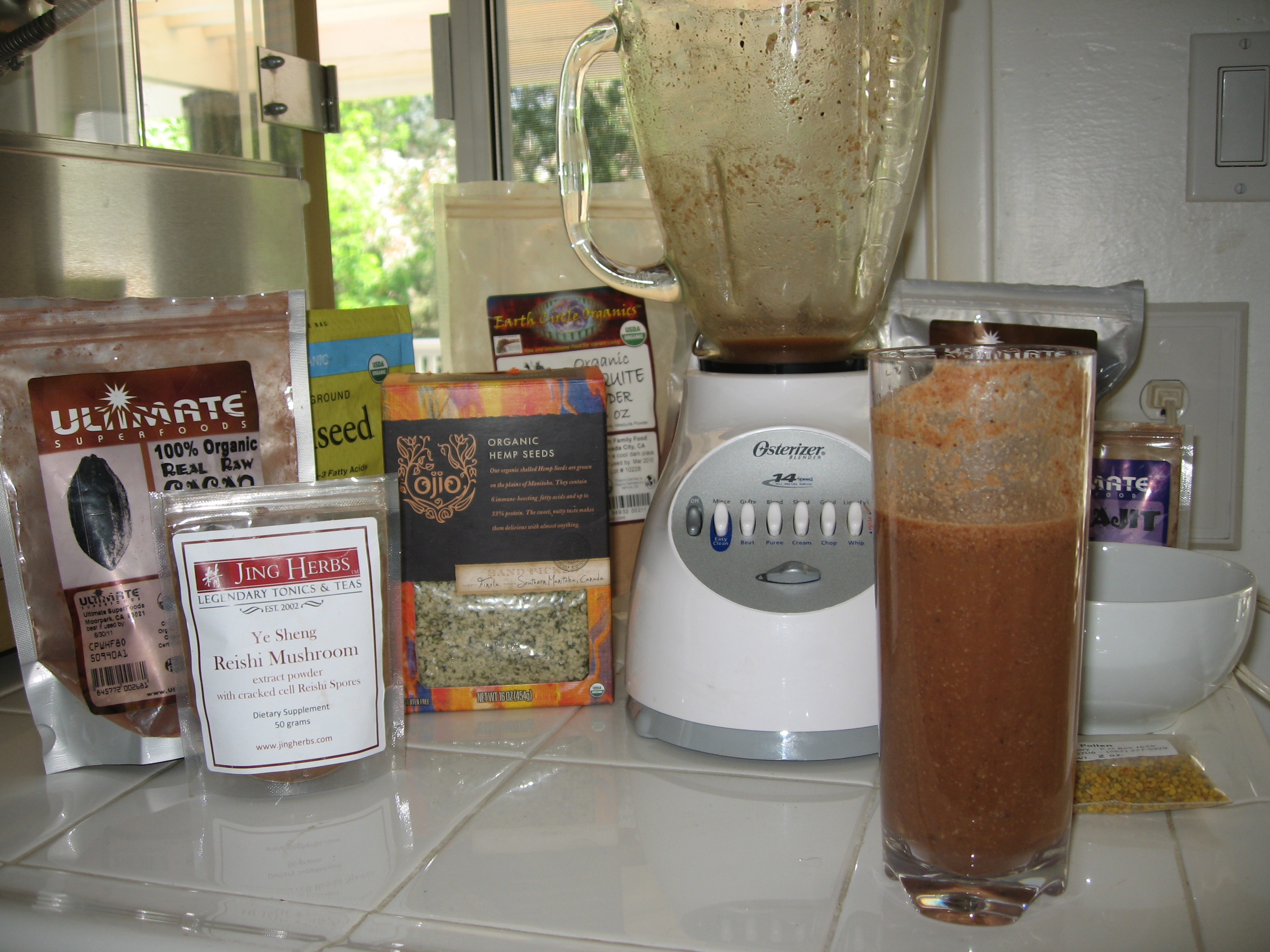 So, every day around 4 p.m. I give my afternoon a little lift by enjoying a delicious superfood smoothie using my friend Robert’s incredible ingredients. The recipe and quantities vary, but the general recipe is this: